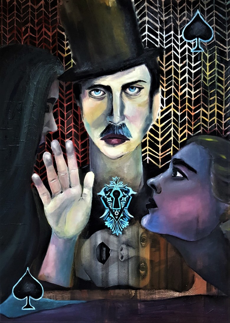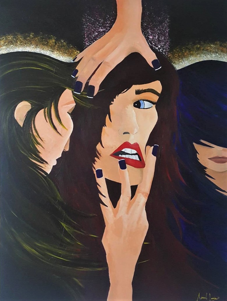 Several of Amanda’s paintings give the sense of a loss of control, of a recognition to societal and cultural forces that would seek to dominate the represented figures. In “Mirror” the main subject, a woman with red lipstick and stark blue eyes, is seen to have her gaze and her focus controlled by hands that extend from outside of the canvas. The subject’s disheveled mouth gives the impression of disgruntled compliance. And then there are the other two figures which we notice after, whose eyes remain hidden as if in sympathy or understanding.