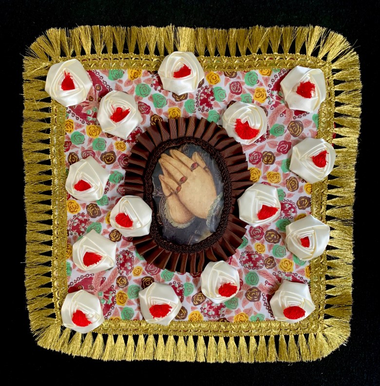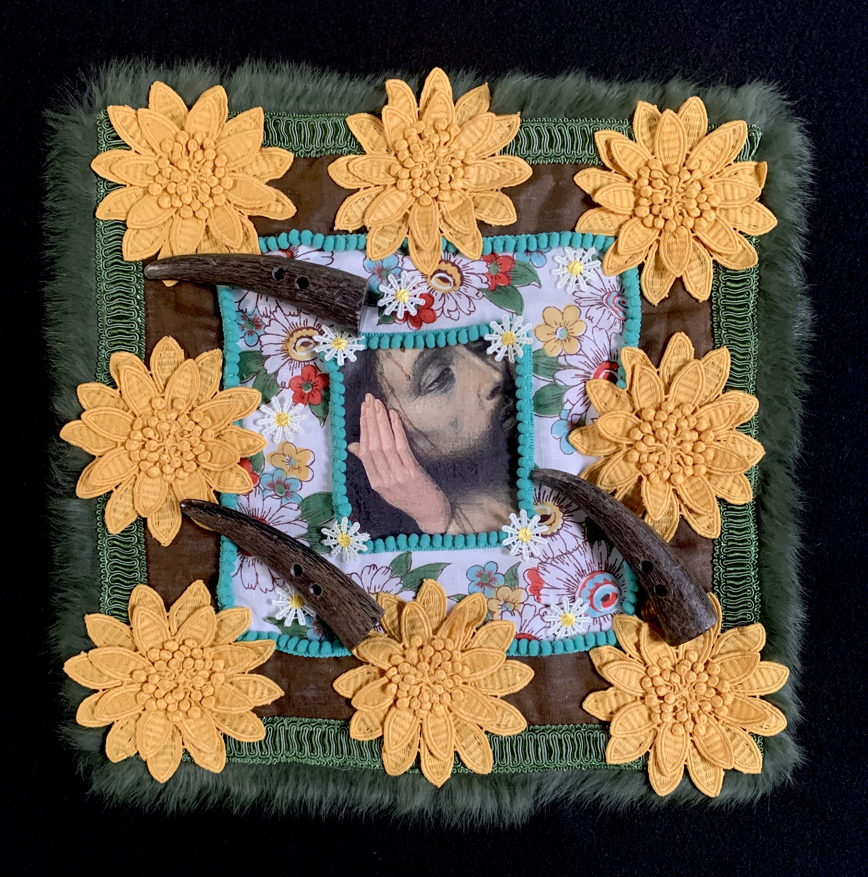 David Dodd Lee, Art Editor: There is an audacity in Johnson Bowles feminist mixed media pieces, a kind of entitlement to rudeness, that feels totally earned. Most immediately, my reaction to Bowles’s artworks was one of repulsion, because, as one gazes upon them, recognizing their formal qualities—composed primarily of fabric, paper, and plastic—they seem to be, generally, inert, until, suddenly, they’re not . . . In fact, each piece is a living, breathing, writhing mass. It’s uncanny valley from the get-go. Sure, there is the jarring contrast in which the fabric signals the “grandmotherly,’ in which the expected sense of orderliness and conformity is quickly subsumed by the horror of death (like a dress torn open to reveal squads of maggots retreating from the light). But there is also a boldness in the work that is close to effrontery, and that is part of what makes Bowles’s “assemblages” so startlingly powerful. There is little subtlety here.