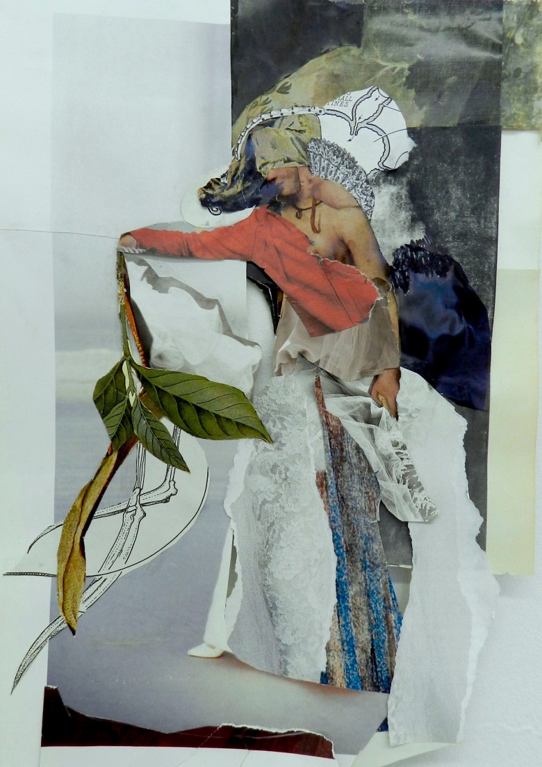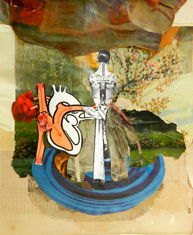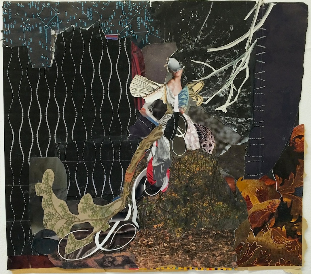 David Dodd Lee, Art Editor: What stands out for me in these collages by Kathy Bruce is the orchestration of high-contrast moments, the highlighting of figuration, combined with an assertion of value in the improvisational, the clear use of nonstandard art materials, and the overall drama signaled by the use of shadow and light. It all just works for me, the tension between the making of the art and the drama implied by the female forms. On the one hand, danger is present in these pieces, violence implied, by the torn fragments of figures, who appear as if glimpsed, momentarily spot lit. They seem to be trapped inside history or myth, but feel uncannily alive. Countering these traditionally representational moments however is the clear presence of the raw materials that are part of the story of each piece’s making.